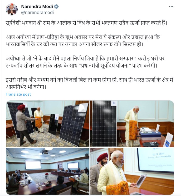 प्रधानमंत्री जी ने 22 जनवरी को श्री राम मंदिर प्राण प्रतिष्ठा के दिन प्रधानमंत्री सूर्योदय योजना की घोषणा की थी। इससे सीधे सूरज की ऊर्जा का उपयोग करके बिजली उत्पादन को प्रोत्साहित किया जाएगा।